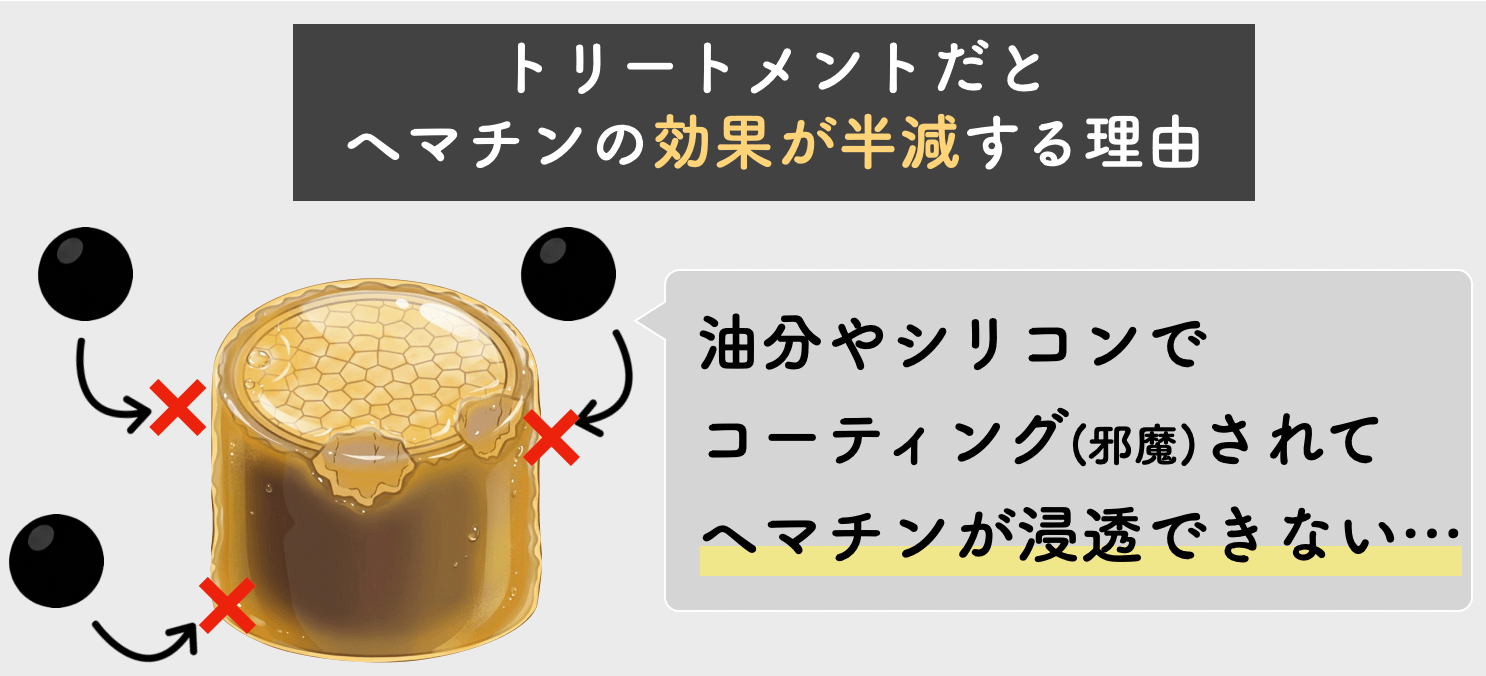 なぜならトリートメントに配合されている油分やシリコンが、ヘマチンが髪の内部に入ることを邪魔してしまうからです。