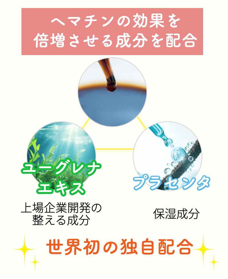 一方で、サポート成分を世界初の独自処方し、ヘマチンの効果を最大限に引き出し「瞬間補修」を実現しています。