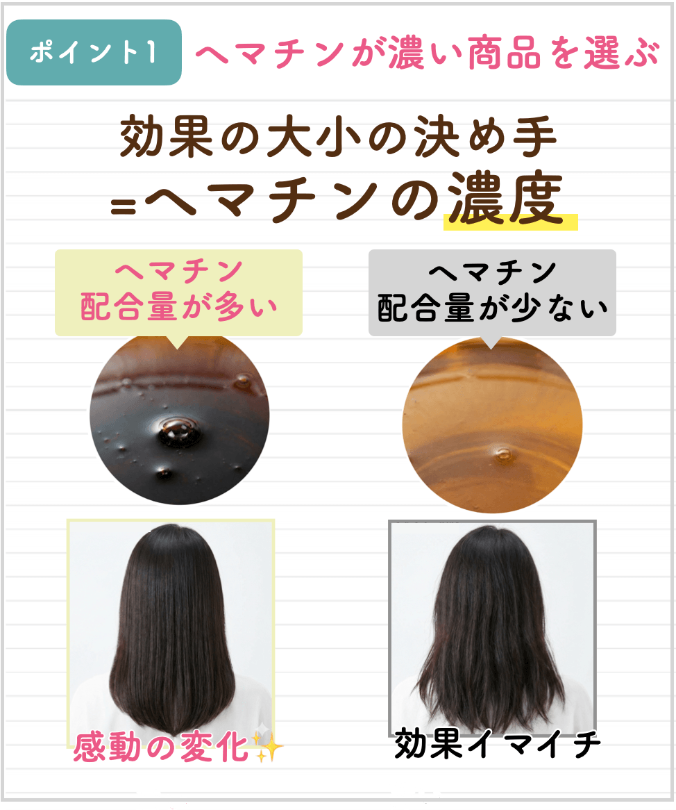 確かにヘマチンが入っていることで、髪のダメージ軽減や保湿が期待できますが、あくまで補助でしかないです…。