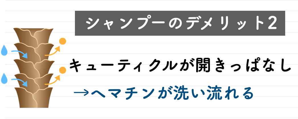 しかも、シャンプー後はキューティクル全開なので、せっかくのヘマチンをほぼ洗い流してしまうことに…。