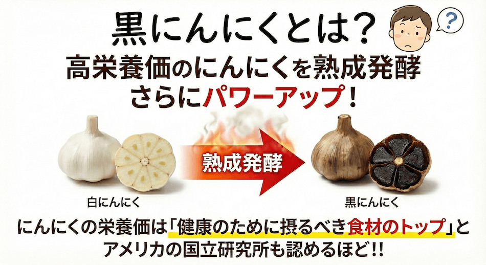 黒にんにくは、にんにくを熟成・発酵することによって、栄養価を高めた食品。