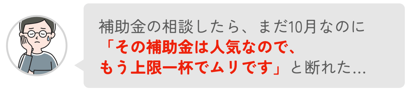 特に人気の補助金は、補助金の公募開始後に申請が殺到し、わずか2〜3ヶ月に予算上限に到達して締め切りに…。