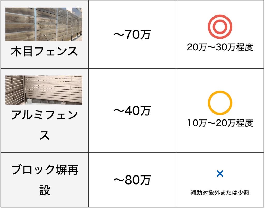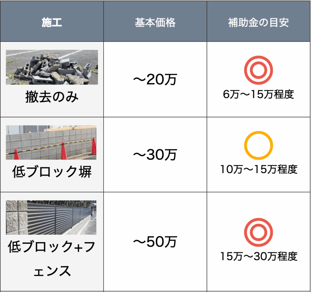 どんな塀に変えるかによって、補助金の“出やすさ”や金額が変わることもあるので、目安を確認してください。